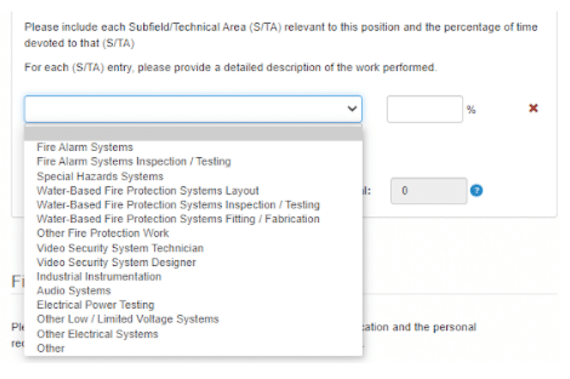 At the bottom of the section, NICET requires that you identify and describe any Subfield/Technical Area (S/TA) relevant to your experience. For each S/TA, you need to briefly describe the work and the percentage of your overall work in this position performed in this area.