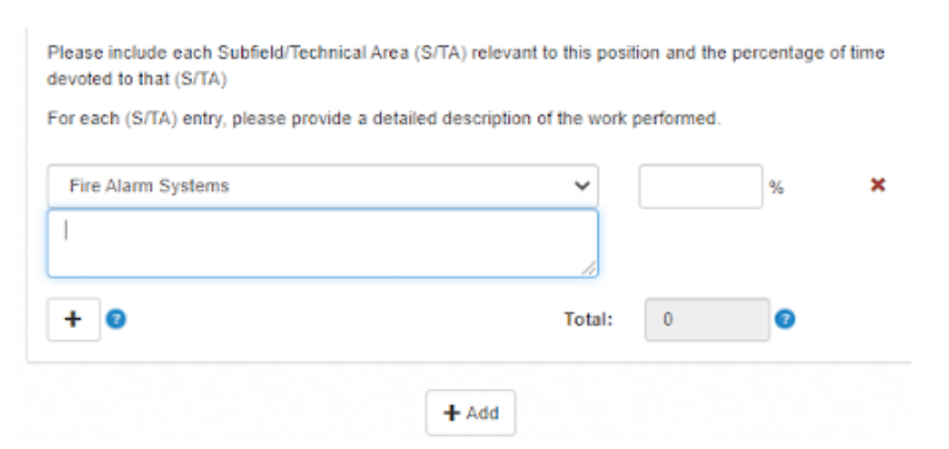 Click the plus sign below the selected S/TA to add S/TA to your current position. Provide percentages and descriptions for each S/TA added. The total percentages are indicated in the lower right. Your total for the S/TA must be 100%. NICET does not allow progression on the form until the total is 100%. NICET requires documentation of your entire work history with your initial application. Additional positions may be added to your experience by clicking the “+ Add” button below your current work history. Continue adding your work history until you have documented your entire career.