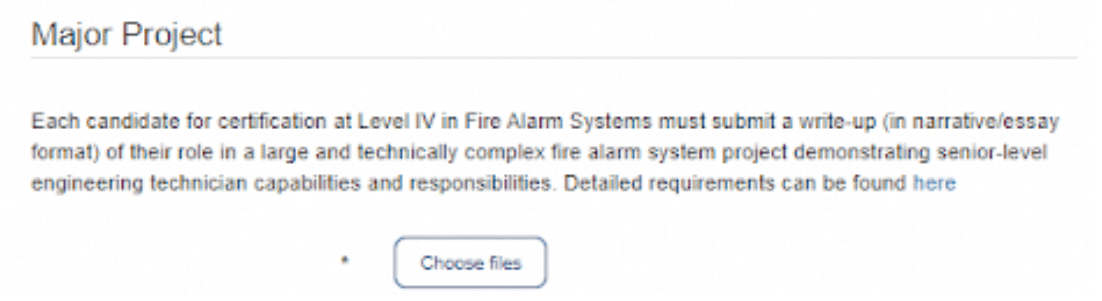A Major Project write-up is required for Level IV certification. The write-up must be completed by the individual seeking certification and provide a narrative of their involvement in a large and technically complex system, demonstrating senior-level technical capabilities and responsibilities. The project is uploaded as an electronic document (typically Word or PDF). The project must be a 2-3 page write-up in narrative or essay form about their role in a “major” project. The write-up should include a description of your role as a Senior Level Technician in the project.